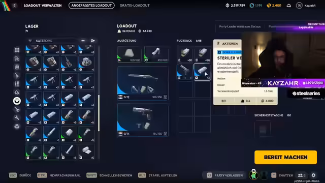 05:40:48Nach einer erfolgreichen PvP-Runde, in der mehrere Gegner eliminiert wurden, bereitet sich der Streamer auf die nächste Herausforderung vor. Er muss erneut Bandagen craften und beklagt den begrenzten Lagerplatz. Die Möglichkeit einer Kooperation mit einem anderen Streamer namens Carsten für gemeinsame Spielsessions wird in Betracht gezogen. Es folgt eine Diskussion über die Vor- und Nachteile von Free-Loadout-Runden, wobei der Streamer die Spontanität und den Reiz des Lootens in diesen Runden schätzt. Er tauscht sich mit einem Freund über die Erfahrungen in Arc Raiders und Call of Duty aus, wobei die Server in Nordamerika als lebhafter und kommunikativer beschrieben werden als die europäischen. Die Schwierigkeit, sich in Extraction Shootern zurechtzufinden, wird thematisiert, und Arc Raiders wird als guter Einstieg für Neulinge empfohlen. Die Vorbereitung auf eine neue Runde beinhaltet die Auswahl von Waffen wie der Venator 4 und der Anvil, sowie das Craften von Heilmitteln und Defibrillatoren, um optimal ausgerüstet zu sein.