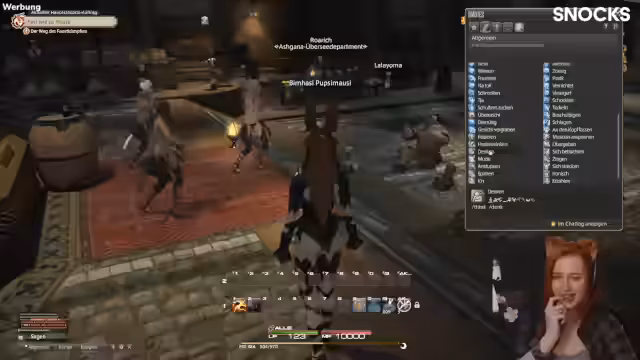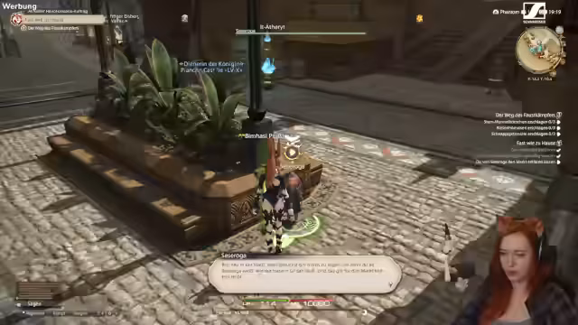 03:10:59Die Streamerin interagiert intensiv mit der Spielumgebung und stellt fest, dass das Spiel Funktionen wie das Verschieben von Fenstern ermöglicht, was sie als neuartig betrachtet. Sie bemerkt auch die Chocobos, fliegende Gestalten im Spiel und gibt einen Überblick über die aktuelle Erweiterung Dawn Trail. Darüber hinaus entdeckt sie verschiedene NPCs und Orte, darunter die Stadt Silseroga mit ihren Handelstraßen und einer besonderen Atmosphäre.