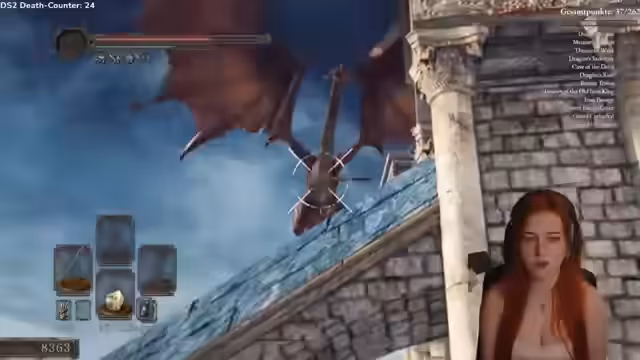 02:21:10Die Streamerin drückt zunehmenden Frust über das Level-Design und die Mechaniken von Dark Souls 2 aus. Sie beschreibt die Gegner als unentspannend und das Environment als das größte Problem. Sie ist genervt von der Reihenfolge, in der sie Gebiete erkunden muss, und von unfairen Situationen, wie z.B. Gegnern, die sie angreifen, während sie selbst beschränkt ist. Sie empfindet den Drachen im Gebiet als besonders dumm und schwer zu besiegen und das Gefühl, das Game wolle sie ohne Gleitgel in den Arsch bumsen, beschreibt sie als eine metaphorische Herausforderung, die sie bewältigen muss.