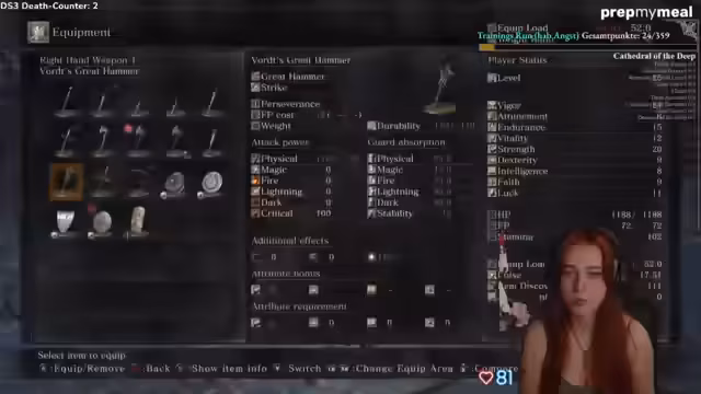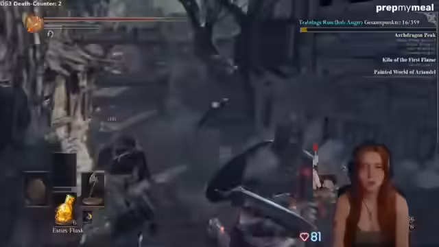 00:49:30Der Stream wechselt von DS3 zu Dark Souls 1, bei dem die Streamerin eine Punktzahl von 100 erreicht hat. Sie äußert den Wunsch, sich weiter zu verbessern und möchte in die Top Ten kommen. Parallel dazu geht sie auf Werbepartner ein. Sie empfiehlt die Unterwäsche von EVIDENZ mit einem Rabattcode, lobt den Tragekomfort und spricht über die Vorteile, keine Sockenpaare mehr suchen zu müssen. Zudem erwähnt sie PrepMyMeal als weitere Empfehlung für proteinreiche, bequeme Mahlzeiten, die aber nicht für den täglichen Gebrauch gedacht sind.