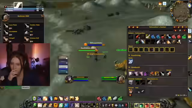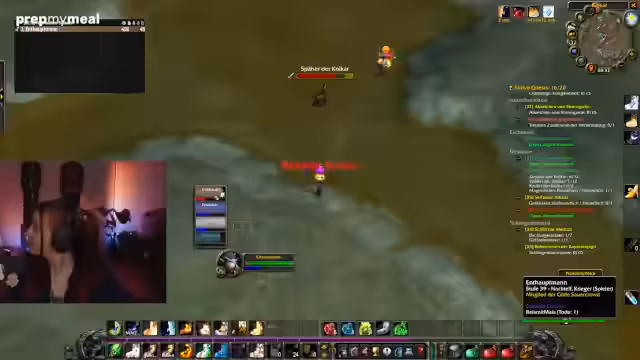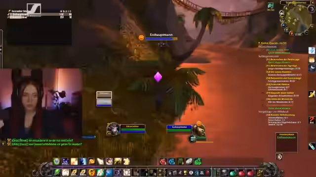 10:31:41Nach der Ankunft in Desolace hat das Team Schwierigkeiten, den richtigen Weg für ihre Quests zu finden. Ein Teammitglied läuft versehentlich in einen Berg anstatt in eine Höhle, was die Ineffizienz des Flugsystems von World of Warcraft kritisiert wird. Der Streamer fühlt sich durch die Gegend bedroht und wird ermutigt, sich einfach von den anderen porten zu lassen. Die Navigation gestaltet sich als mühsam, da die Wege verwirrend sind und die Stufe der Gegner als ' arschgefährlich' und 'überleveled' beschrieben wird.