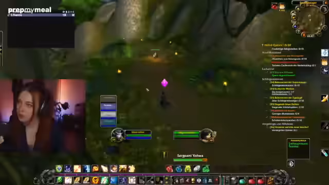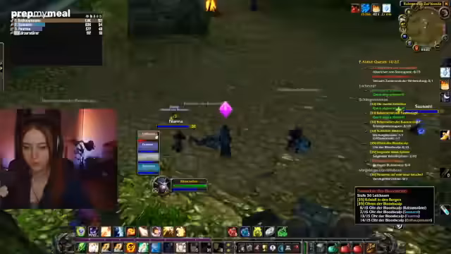 02:55:19Die Streamerin stößt auf technische und in-game Probleme. Sie ist von einem plötzlich auftauchenden Gegner überrascht und muss sich behaupten. Bei der Quest 'Beherrschen der Pantherjagd' gibt es Verwirrung, da die Quest-Items nicht geteilt werden können. Auch die Quest 'Wambu' wird als äußerst belastend und schlimm beschrieben. Das Quest-Log ist voll und es gibt Schwierigkeiten, neue Quests anzunehmen.