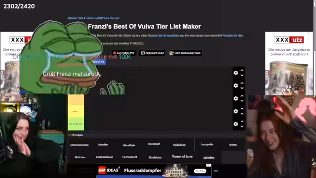 03:37:22Ein zentraler Punkt des Streams ist die gemeinsame Erstellung einer 'Vulva-Synonym-Tierlist'. Diverse Begriffe wie 'Schmuckkästchen', 'Entsafter' oder 'Wurstfach' werden diskutiert und in Kategorien wie 'vagitastisch', 'bodenlos' oder 'gespaltenen Meinung' eingeordnet. Die Diskussionen sind oft humorvoll, gelegentlich anstößig und reflektieren die gesellschaftliche Wahrnehmung und den Tabubruch solcher Begriffe.