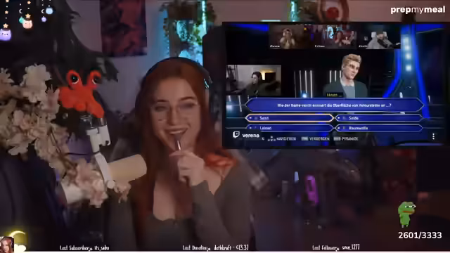 03:29:12Beim Quiz wird eine knifflige Multiple-Choice-Frage gestellt, bei der die Teilnehmer auf ihr Bauchgefühl vertrauen müssen. Die Streamerin ist sich ihrer Antwort 'C' nur zu 90 Prozent sicher und fürchtet einen Bug im Spiel. Es folgt eine hitzige Debatte über das Niveau der Fragen und die Risikobereitschaft. Ein Teilnehmer schlägt vor, einen weiteren Mitspieler hinzuzuziehen, was jedoch abgelehnt wird, um das Spiel fair fortzusetzen.