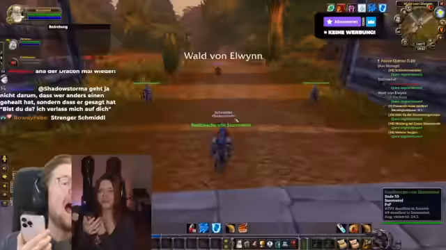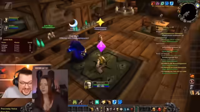 02:15:51Um die XP-Rest auszunutzen, wird beschlossen, gemeinsam im Hinterland zu questen und Farmgruppen zu bilden. Es wird über die Zusammenarbeit mit einem Tank, um das Leveln zu erleichtern, diskutiert. Parallel dazu findet eine lockere Diskussion über Rollenspiel (RP) statt, bei der über die Möglichkeit von RP-Heterosexualität und freiere Heiratskonzepte in der Spielwelt gesprochen wird. Ein Fehler beim Whispern im Chat wird erwähnt.