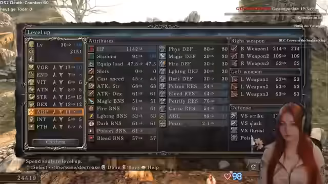 00:17:30Die Streamerin widmet sich dem eigentlichen Training für den Dark Souls 2 Run. Sie analysiert ihre Startklasse, Deprived, und ihre voraussichtlichen Schwächen, insbesondere den niedrigen Lebenspunkt- und Adaptability-Wert. Sie diskutiert mögliche Waffen wie das gebrochene Schwert und den Morgenstern und plant, zunächst die Anfangsregion sorgfältig und ohne Tod abzugrasen, um Punkte zu sammeln und sich zu verbessern. Der Fokus liegt auf einer ruhigen und fehlerfreien Vorgehensweise.