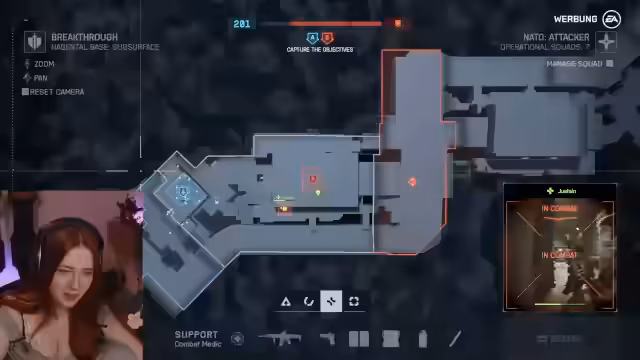 03:14:43Die Streamerin startet den Modus 'Breakthrough' auf der Karte 'Contaminated', die im Bayerischen Wald angesiedelt ist. Ihre Rolle ist die des Angreifers, während das gegnerische Team verteidigen muss. Es gibt technische Unklarheiten über das Ticket-System, das für das Spielende entscheidend ist. Die Spielerin ist mit der Karte und den Spielmechaniken noch nicht ganz vertraut, was zu anfänglichen Schwierigkeiten und Fehlern führt, wie z.B. das versehentliche Platzieren eines Fahrzeuges.