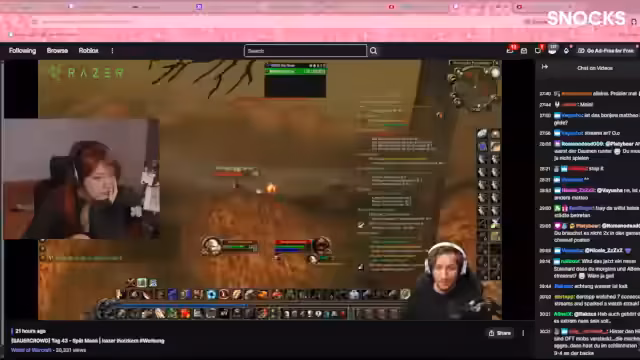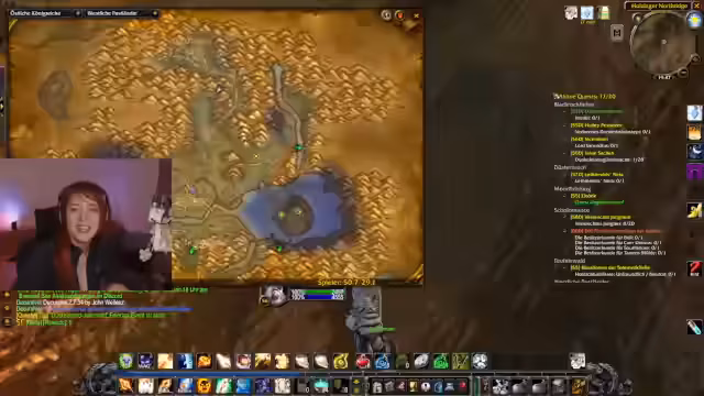 04:25:09Der Stream konzentriert sich auf das Leveln und das Bewältigen von Quests im Spiel World of Warcraft. Es werden Diskussionen über Spielmechaniken geführt, wie das richtige Strafen (Seitwärtsbewegung während des Angriffs) und die Verwendung von Gegenständen wie Federn für sicheres Springen. Die Charaktere kämpfen gegen verschiedene Gegner, einschließlich Elites, und streben danach, wichtige Quests abzuschließen, um das Level 60 zu erreichen. Ein entscheidendes Ereignis ist das Entdecken und das anschließene Klettern in einem Turm, was zu einem beinahe tödlichen Absturz und einem hitzigen Streit über die Risikobereitschaft führt.
