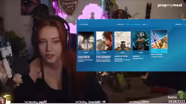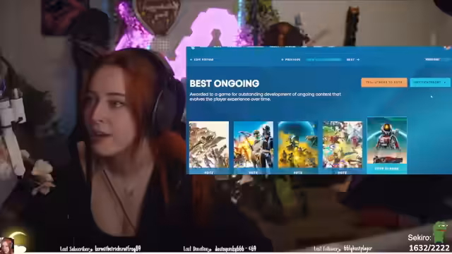 04:14:55Die Kategorie 'Best Ongoing Game' wird diskutiert, wobei Spiele wie 'Marvel Rivals', 'Helldivers', 'No Man's Sky' und 'Final Fantasy VII' (hier als 'Ziv' interpretiert) nominiert sind. Die Sprecherin bemerkt, dass 'Helldivers' zwar einen Hype hatte, aber sie aktuell nichts mehr davon mitbekommt. 'No Man's Sky' wird für seine kontinuierliche Weiterentwicklung gelobt, da es „immer besser“ wird. Die Erfahrung von 'League of Legends'-Spielern wird humorvoll als „absolute Depression“ beschrieben, was die konstante Entwicklung von 'No Man's Sky' hervorhebt. Die Sprecherin erinnert sich an ihre Zeit bei Fortnite und wie es immer ein Thema war, eine Frau auf Discord-Servern zu sein. Sie äußert den Verdacht auf „Formel-Wahl-Manipulation“, da die Webseite zur Abstimmung nicht zur nächsten Kategorie wechselt. 'Baldur's Gate 3' wird erwähnt, obwohl es letztes Jahr nominiert war, was die Sprecherin zu der Annahme bringt, dass die Stream Awards „hardcore rigged“ sind. Trotz anfänglicher Skepsis entscheidet sie sich für 'Helldivers', da es anscheinend immer noch eine aktive Community und guten Support hat.