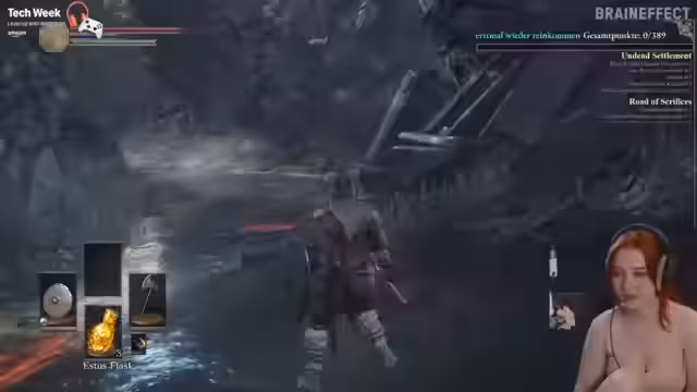 02:34:42Vor dem Betreten des Spiels kämpft die Streamerin mit technischen Problemen in der OBS-Software, was zu Framedrops und einem kleinen Stream-Bild führt. Trotz der Schwierigkeiten startet sie in den Anfangsbereich des Spiels und beginnt mit dem Sammeln von Seelen. Sie testet verschiedene Fähigkeiten wie Parieren und plant, Feuerbomben gegen den ersten Boss einzusetzen.