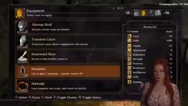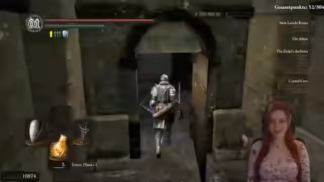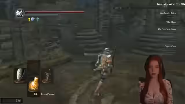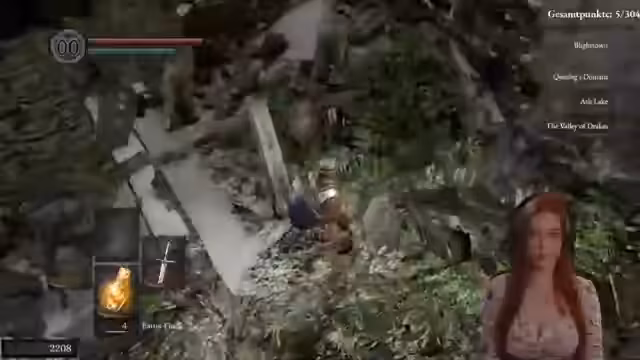 04:51:02Der Stream konzentriert sich auf die Rückkehr zum Asylum in Dark Souls. Die Protagonistin strebt nach der Ausrüstung des Black Knight Herbert, um dessen Endurance zu nutzen, und muss sich dabei orientieren. Sie entscheidet sich, das Schild auszurüsten und überlegt die strategische Verwendung von Humanity. Dabei werden technische Unterschiede zwischen den Geschlechtern im Spiel erwähnt und ein Spendenaufruf für Abonnenten initiiert.