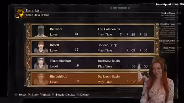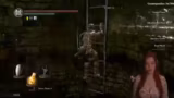 01:57:29Nach den Gargoylen navigiert die Streamerin durch das Level, um zum nächsten Boss, dem Capra Demon, zu gelangen. Sie zeigt Unsicherheit bezüglich des optimalen Weges und ist in hohem Maße gestresst. Sie wechselt ihre Waffe, um besser auf die Situation mit den Hunden des Capra Demon reagieren zu können, und bereitet sich mental auf den als besonders schwierig geltenden Bosskampf vor.