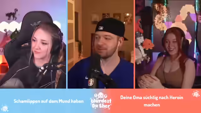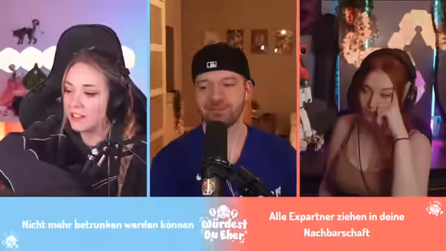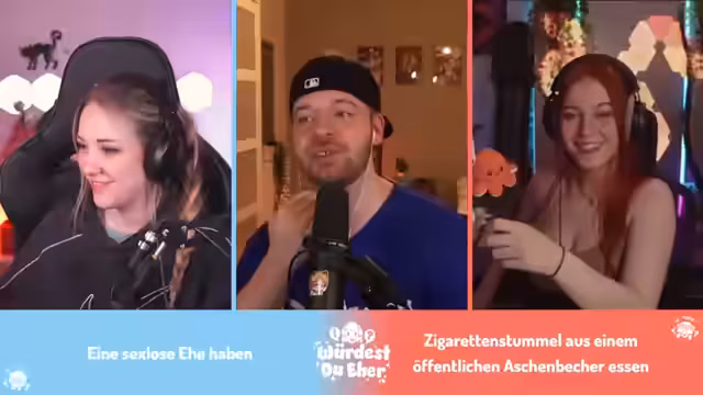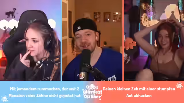 05:17:55Der Stream beginnt mit einer Reihe von provokativen hypothetischen Fragen aus dem Spiel 'Pick your Poison'. Die Streamerin und ihre Gäste diskutieren intensiv, was sie vorziehen würden: beispielsweise ihre Hand in eine Fritteuse zu stecken oder ihre Geburt jedes Jahr neu zu erleben. Letzteres wird als posttraumatisch belastend eingestuft, da es starke Schmerzen und mögliche Traumata auslösen könnte. Auch die Frage, ob man lieber mit jemandem mit mangelnder Hygiene oder amputiertem kleinem Zeh leben würde, löst kontroverse Diskussionen über Schmerz, Ekel und langfristige psychische Belastung aus.