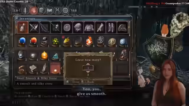 06:59:15Nach dem Bosskampf widmet sich die Streaminer der Verwaltung ihres Inventars und der Reparatur ihrer stark abgenutzten Waffe. Sie ist frustriert über die geringe Haltbarkeit ihrer Keule und diskutiert mit dem Chat über verschiedene Waffen, Stat-Punkte und Ausrüstungsgegenstände. Sie überlegt, ob sie bestimmte Items verkaufen oder behalten soll, und plant ihren weiteren Weg durch das Spiel.
