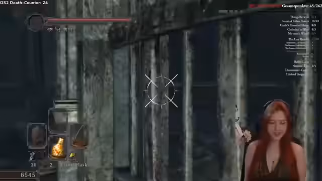 06:51:14Die Streamerin stellt sich einem Bosskampf, bei dem es sich um eine verletzte, traurige Frau handelt. Sie tötet den Boss, bedauert aber dessen Schicksal und vermisst die Cutscene, die die Geschichte hinter der Figur hätte erzählen können. Sie erhält dessen Seele und stellt Fragen über die nächsten Schritte und die Geschichte des Charakters, der jetzt wahrscheinlich im Himmel vereint ist.