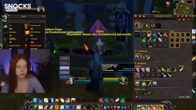 04:36:43Auf dem Darkmoon Fair angekommen, konzentriert sich die Gruppe darauf, Buffs zu erhalten und Items zu sammeln. Die Streamer erklären, wie man durch die Auswahl bestimmter Dialogoptionen bei Wahrsagern verschiedene Buffs aktivieren kann, die z. B. mehr Schaden oder mehr Willenskraft gewähren. Gleichzeitig wird gezeigt, wie man durch das Handeln von selbst hergestellten Gegenständen Spielwährung, sogenannte Lose, für weitere Aktivitäten auf dem Jahrmarkt erwerben kann.