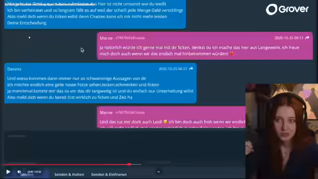 03:49:47Während des Chats werden extrem explizite Nachrichten und Nacktbilder von Nutzern verschickt, was zu Ekel und moralischen Bedenken führt. Ein verheirateter Nutzer schickt ein Nacktbild, was die Streamerin wütend macht, da er seine Frau betrügt und gleichzeitig viel Geld für Fake-Profile ausgibt. Die Aggressivität und die explizite Sprache in den Chats werden als problematisch empfunden. Die Streamerin wird aufgrund zu langer Antwortzeit aus dem Chat ausgeloggt, was sie als Erleichterung empfindet, da sie nicht auf die expliziten Nachrichten antworten muss. Es wird diskutiert, dass viele dieser Nutzer sexuell frustrierte Männer sind, die im echten Leben keine Partner finden. Die moralische Grenze des Chat-Moderators wird bei Kunden mit körperlichen oder geistigen Einschränkungen gezogen, die dann abgegeben werden, was als fragwürdiger moralischer Kompass empfunden wird. Die Frage, ob Nutzer wirklich nicht merken, dass sie mit Fake-Profilen schreiben, wird aufgeworfen, da die Kommunikation oft unrealistisch und übergriffig ist.