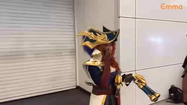 00:41:27Sie berichtet von ihrer aktuellen Situation auf der Messe, seit 11:30 Uhr anwesend, aber mit anfänglichen halbstündigen Internetproblemen. Sie zeigt und erklärt Details ihres Captain Fortune Cosplays, das sie größtenteils selbst angefertigt hat, und nennt den Grund für ihre Wahl dieses Skins gegenüber dem originalen Miss Fortune Design.