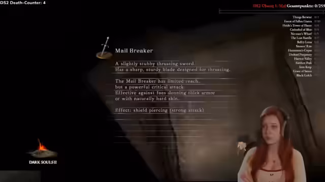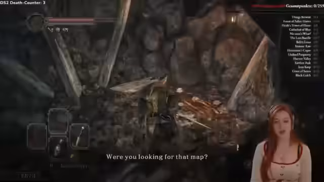 06:26:34Nach einigen Orientierungsproblemen und einem langen Weg durch ein gefährliches Gebiet trifft die Streamerin auf den ersten Boss, den Verfolger. Die Auseinandersetzung ist für sie sehr stressig und sie stirbt mehrmals. Schließlich gelingt es ihr, den Boss nach mehreren Versuchen zu besiegen und erhält eine Belohnung. Sie vergleicht die Schwierigkeit dieses Bosses mit dem Asylum-Dämon aus dem ersten Teil und stellt fest, dass Dark Souls 2 schon am Anfang sehr fordernd ist, was ihre Frustration über die langen Wege und den Heiltrank-Animationsdelay verstärkt.