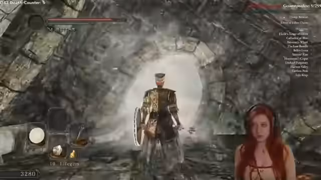 05:34:55Zu Beginn des Streams werden die ersten Eindrücke von Dark Souls 2 geschildert. Die Protagonistin befindet sich in einer unübersichtlichen Umgebung, die durch gruselige Geräusche und unklare Hinweise eine bedrohliche Atmosphäre erzeugt. Sie fühlt sich überfordert, da das Spiel eine Fülle an Mechaniken, wie das Leveln von Rüstung, Ausdauer, Leben und verschiedenen Attributen, erfordert. Besonders kritisch gesehen wird das neue Ausweichsystem (ADP), das separat gelevelt werden muss und eine sofortige Ausweichbewegung verhindert, was die Einstiegshürde deutlich erhöht.