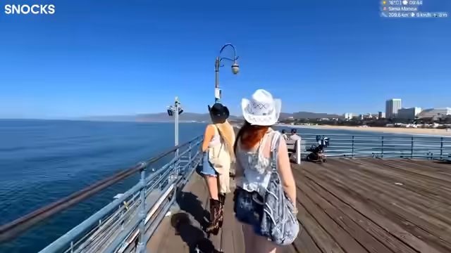 00:27:24Die Streamerin und ihr Begleiter sind am Santa Monica Pier angekommen. Sie diskutieren über die geschlossenen Geschäfte und Cafés und die ruhige Atmosphäre am Morgen. Es gibt verschiedene Aktivitäten wie Angeln, das Fotografieren von Sehenswürdigkeiten und das Beobachten der Wellen. Die Streamerin erwähnt den Route-66-Endpunkt und das Riesenrad, das sie besichtigen möchten. Sie äußert ihre Freude über das gute Wetter und die Möglichkeit, Fotos zu machen.