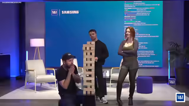 00:28:09Nach der Präsentation der Hardware folgt ein interaktives Jenga-Spiel, bei dem die Streamer Kim und Adam gegeneinander antreten. Moderator Marios leitet das Spiel an, wobei er die Regeln spontan anpasst und für Spannung sorgt. Nach anfänglichen Schwierigkeiten mit den nicht ganz klaren Regeln gewinnt Kim das Spiel und den ersten Punkt.