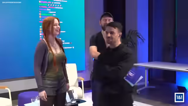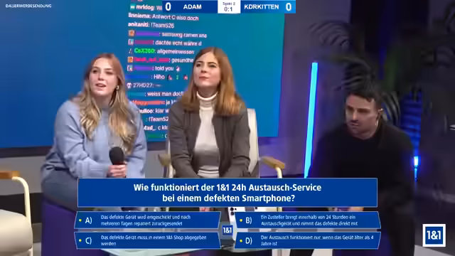 00:43:29Anschließend wird ein Quiz mit Fragen zu Samsung und 1&1 veranstaltet. Die Teilnehmer antworten auf ihren Handys, und die Experten Alexia und Jana stehen als Joker zur Verfügung. Die erste Frage zur Geschichte von Samsung wird falsch beantwortet, die zweite zum 1&1 24-Stunden-Austauschservice richtig. Kim setzt einen Joker und gewinnt, wodurch der Stand ausgleicht wird.