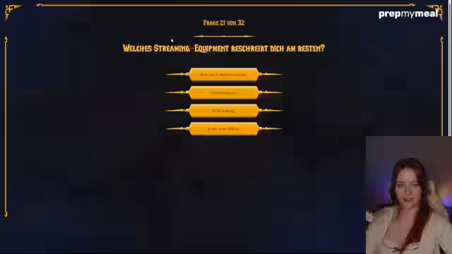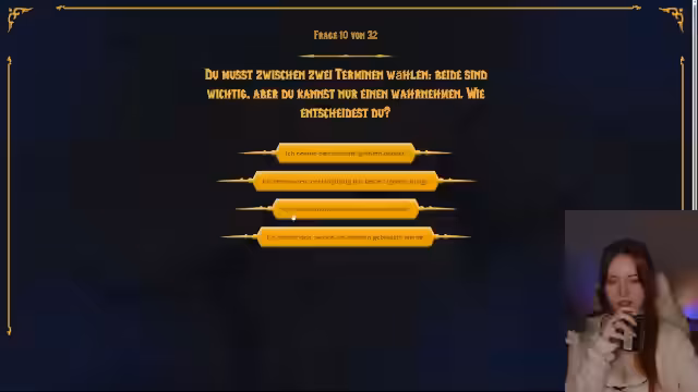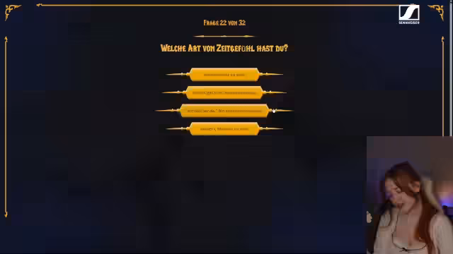 01:45:26Um die passende WoW-Rasse zu ermitteln, wird ein Rassen-Quiz durchgeführt. Streamer betont, dass ohne Login teilzunehmen laut Regeln möglich sei, um gezielt nach Nachtelf-Antworten zu suchen. Es werden Fragen zu Humorvorlieben (z. B. trockener/schwarzer Humor), Stressreaktionen und Entscheidungsfindung gestellt, wobei Antworten gezielt an Nachtelf-Eigenschaften angepasst werden.