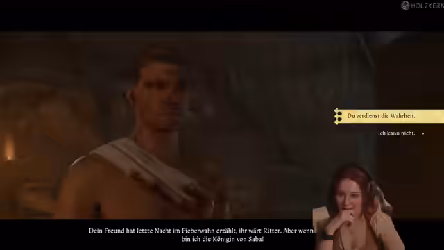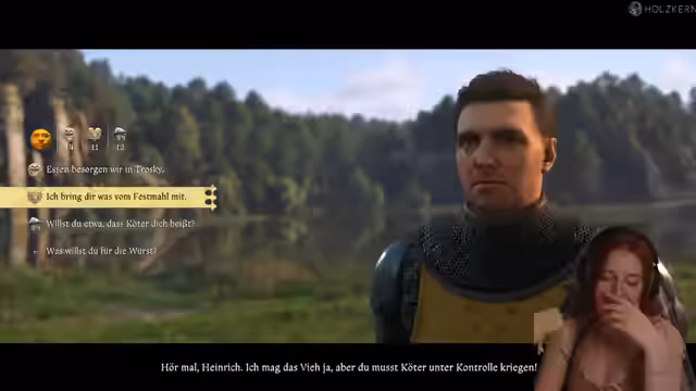 02:03:44Nach den technischen Einstiegshürden beginnt die Streamerin mit dem eigentlichen Gameplay. Sie steuert die Hauptfigur Henry durch die Spielwelt und interagiert mit NPCs und der Umgebung. Der Fokus liegt auf der realistischen Darstellung der mittelalterlichen Welt, der schweren Rüstungen und der unkonventionellen Kämpfe. Sie experimentiert mit Dialogoptionen, Waffen, dem Hund „Köter“ und erkennt, dass die Entscheidungen und Fähigkeiten des Charakters den weiteren Verlauf der Geschichte maßgeblich beeinflussen.
