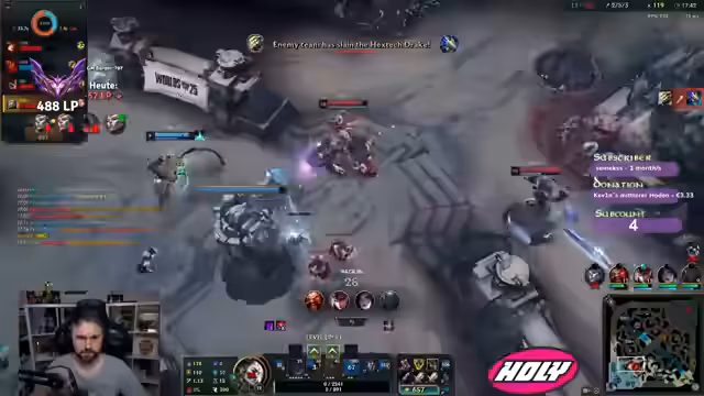 00:08:59Während eines League of Legends-Spiels auf der Top-Lane mit dem Champion Zaheen bewertet der Streamer den anfänglichen Spielverlauf als schwierig, da sein Team keine klare Strategie hat und nicht frühzeitig Vorteile erzielen kann. Er versucht, sich durch konsequentes Farmen ins Spiel zu bringen. Nach einem frühen Tod kritisiert er einen misslungenen Trade und seine eigene Entscheidung, spät zu kämpfen. Er erkennt an, dass das Matchup aufgrund des Gegner-Builds für ihn unspielbar war und er keine Chance hatte, auch durch spätere Item-Änderungen.