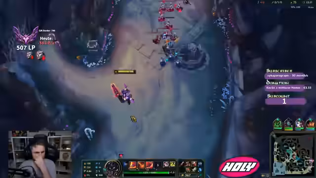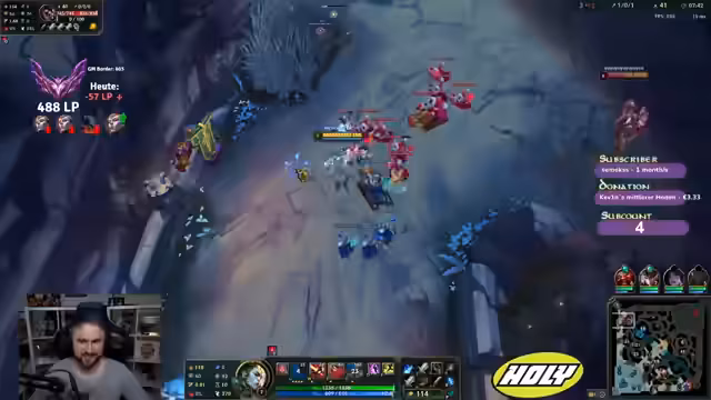 02:41:53Ein guter Trade auf der Toplane wird gelobt, doch der Spieler hat Angst, den Vorteil nicht halten zu können. Er kritisiert einen fehlenden Bot-Gank, der den Gegner einen Turm nehmen ließ, und ist frustriert über die fehlende Koordination des Teams. Obwohl er einen Kill einstreichen kann, wünscht er sich, einen Kill von einem gegnerischen Gragas verhindert zu haben, um den Vorteil zu sichern. Er beschreibt die anstrengende Spielsituation und das Gefühl, überfordert zu sein.