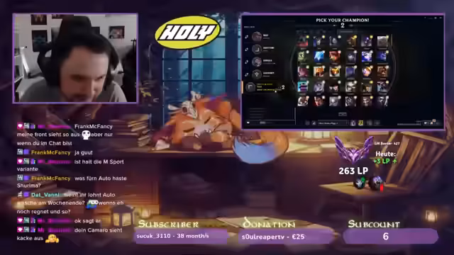 00:07:19Der Fokus verlagert sich auf aktuelle League of Legends-Spiele. Der Streamer kommentiert Live-Geschehnisse, wie zum Beispiel seine Performance als Darius gegen einen Cinthion-Support, gibt Tipps und analysiert seine Spielzüge. Er interagiert mit dem Chat und reagiert auf Kommentare von Zuschauern, wie 'Shurima' und 'Chirox', während er über Spielentscheidungen, wie das Bannen eines Champions oder die Item-Wahl, diskutiert.