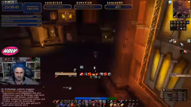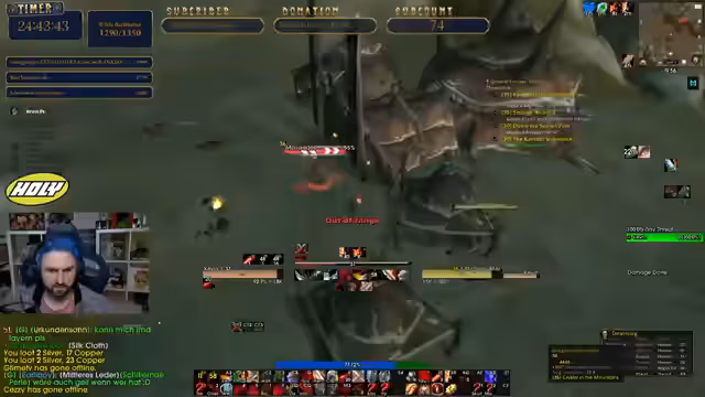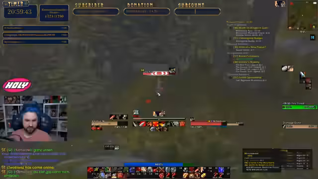 10:58:36Der Kampf gegen den Endboss Van Cleef beginnt. Der Streamer gibt taktische Anweisungen an die Gruppe, wie der Boss angezogen und welche Adds zuerst angegriffen werden sollen. Es gibt einen Moment der Unsicherheit, als der Streamer kurz ausloggt, aber der Kampf geht weiter. Die Gruppe hält die Adds fest und bereitet sich auf den finalen Schlag gegen Van Cleef vor.