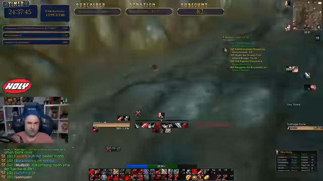 08:32:25Der Streamer analysiert einen knapp abgewendeten Tod. Er wollte auf einen Mob chargen, doch in diesem Moment wurde der Mob von einem anderen Spieler getötet. Dieser Umstand hätte zu seinem eigenen Tod geführt, da er seine Fähigkeit „Charge“ nicht mehr verwenden konnte. Er macht sich Sorgen, dass Zuschauer sein Gameplay kritisieren, ist aber im Nachhinein noch amüsiert von der Situation. Er plant, die Region zu verlassen, um den Ghost-Ding zu farmen.