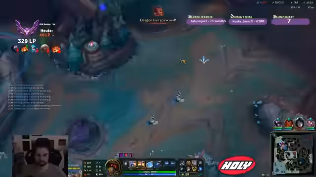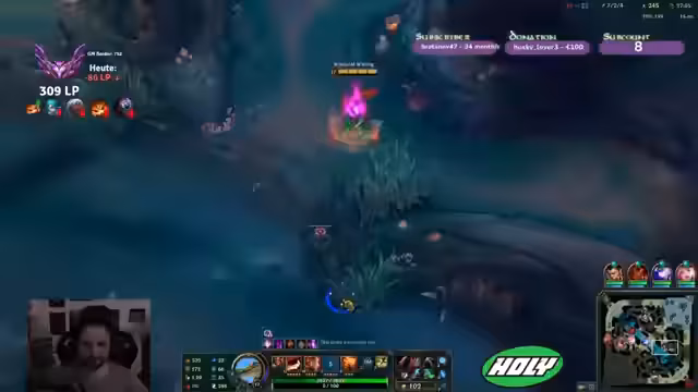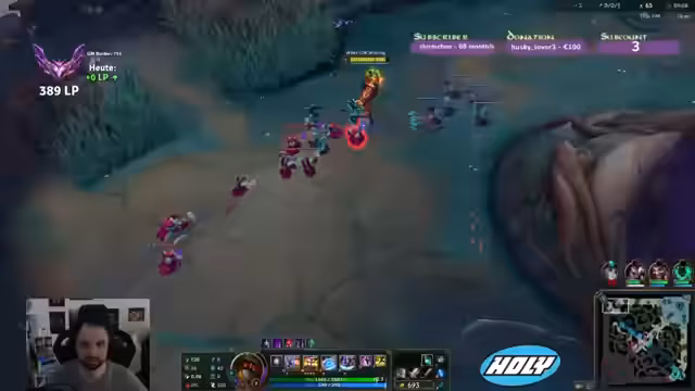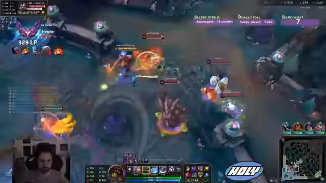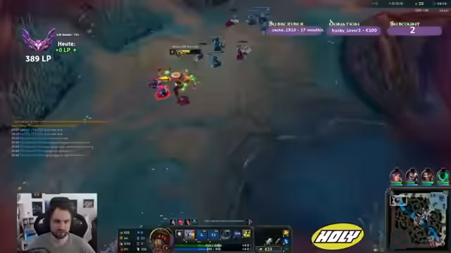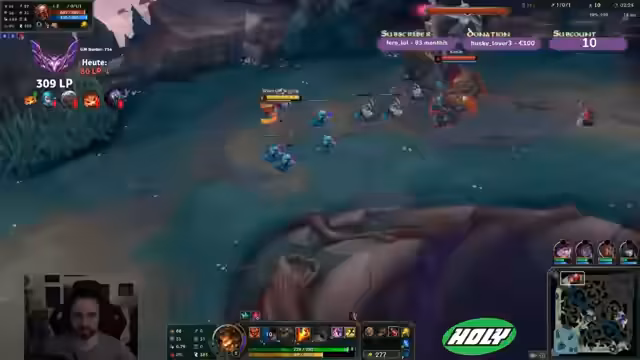00:13:10Während des Spiels gibt es mehrere kritische Teamkämpfe. Einmal wird ein möglicher Kill an eine feindliche Thresh verpasst, was als sehr bitter empfunden wird. Später gibt es einen großen Engage, der jedoch nicht optimal genutzt wird und zu einer misslungenen Situation führt. Der Streamer frustriert über das Verhalten der Botlane, die Permanent verliert, und über Entscheidungen des Gegner-Teams.
