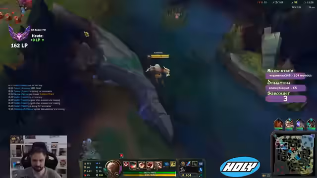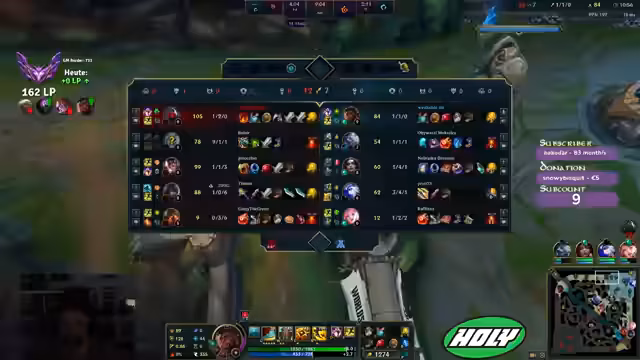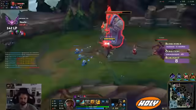 00:16:24Der Streamer konzentriert sich wieder auf sein League of Legends-Spiel. Er spielt Vladimir und baut sein Item auf. Er analysiert die Situation im Spiel und muss eine wichtige Entscheidung treffen: Soll er sich in einen Fight einmischen oder sicher seine Farm fortsetzen? Er entscheidet sich dafür, mit seinem Ultimate eine Kolosso zu jagen, um den Kill zu holen. Die Szene ist actionreich und er kritisiert die Item-Builds des Gegners.
