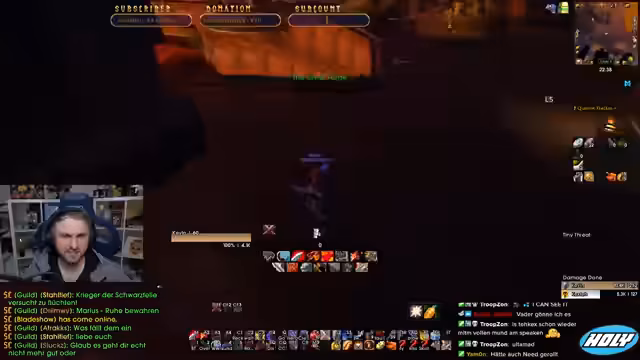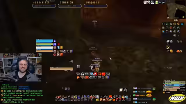 01:15:15Das Stream-Team absolviert nun die geplanten Runs in Maraudon. Der Streamer beschreibt den Verlauf des Spiels, den Umgang mit Mobs und den Kampf gegen verschiedene Gegner, wobei er die Effektivität der Gruppe bewertet. Es kommt zu kritischen Momenten, in denen der Streamer hektisch heilt und agiert. Das Team kommuniziert eng, um Koordination zu gewährleisten, und das Streamer-Team arbeitet daran, einen seltenen Gegner zu lokalisieren und zu besiegen.