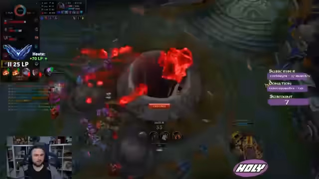 03:40:37Ein hohes magisches Schadenspotenzial durch eine Ultimate oder Q-Fähigkeit wird registriert. Der Streamer vermutet Varus als Quelle und stellt fest, dass der Gegner im späteren Spielverlauf ein Randoins sowie eventuell ein Guardian Angel besitzt. Die taktische Situation wirkt komplex.