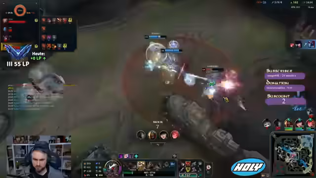 00:08:01Der Streamer interagiert intensiv mit dem Chat, begrüßt Zuschauer wie Maya, Zündler und Kiwi und diskutiert deren Game-Fortschritte. In der laufenden Partie entscheidet er sich für einen aggressiven Play, indem er den Gegner in der Lane angreift und zu einem frühen Kill führt. Er analysiert die Item-Builds und stellt die spielerische Entscheidung in Frage, ob er früher ultimieren hätte sollen.