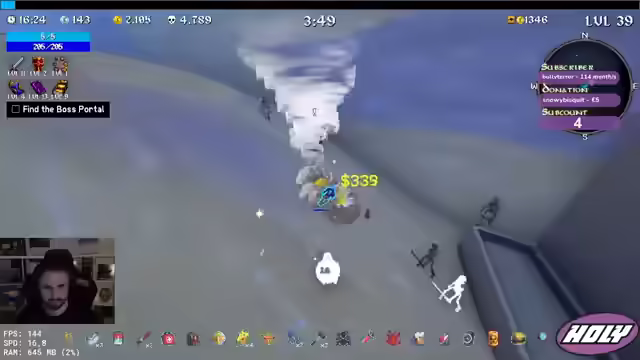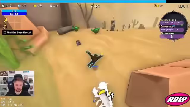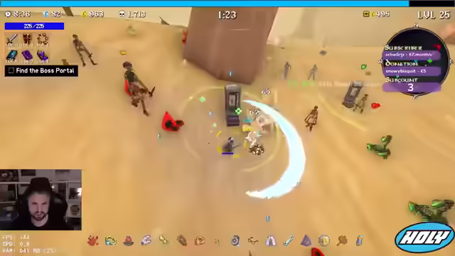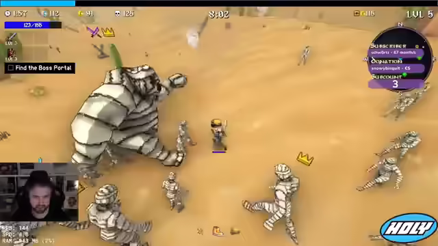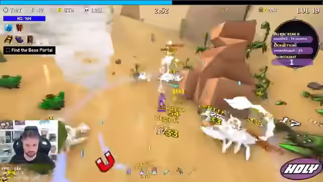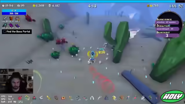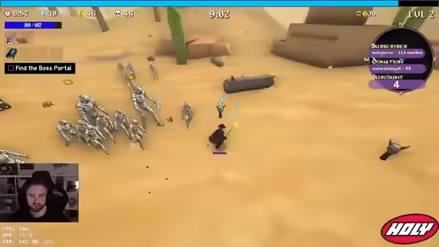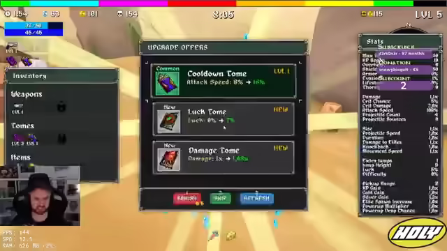 00:44:46Der Streamer entscheidet sich für einen Triple-Boss-Kampf und besiegt die Bosse ohne große Probleme. Er sammelt XP und überlegt, welche Items er wählen soll, entscheidet sich aber für mehr Crit-Damage und Freeze. Er stellt sein Verfahren um und wählt Project-Account und Crit-Damage. Er findet das Portal und besiegt den Sand Golem, wobei er feststellt, dass immer mehr Knochen herauskommen. Er holt sich mehr Käse, um seine Werte zu verbessern. Er nimmt Attack Speed und Project Tiles. Er versucht, den Bandit zu besiegen, muss aber feststellen, dass dieser zu stark ist. Er wird von Bombern angegriffen und muss fliehen. Er holt sich noch mehr HP und Damage. Er muss zum Boss und holt sich noch einen Magneten.