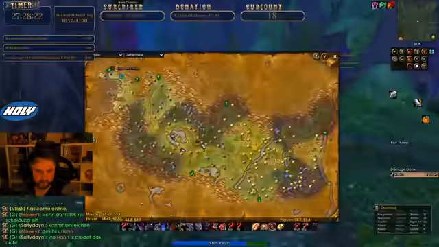 07:22:50Der Streamer kehrt zurück zum Gameplay in Azeroth. Er erklärt seine Queststrategie und plant, verschiedene Aufträge in Gebieten wie Westfall und Booty Bay abzuschließen. Um seine Effizienz zu steigern, holt sich sogenannte World Buffs, die seine Stats für eine Stunde oder zwei deutlich erhöhen. Er organisiert dafür ein Portal, um von einem Buff-Standort zum nächsten zu gelangen.