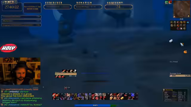 13:24:16Der Streamer versucht vergeblich, eine Gruppe für den Dungeon Burg Schattenfang zu finden. Viele potenzielle Mitspieler sind bereits in einer Gruppe oder haben keine Zeit. Der Streamer ist frustriert, versteht aber die Situation. Er plant, den Dungeon stattdessen am nächsten Tag weiter zu verfolgen. Er erwähnt seinen geplanten Stream für den nächsten Tag von 9 bis 16 Uhr und wünscht seinen Zuschauern eine gute Nacht.