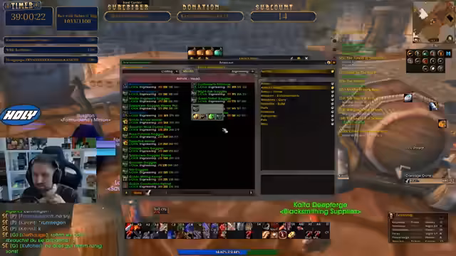 06:29:18Der Streamer ist frustriert über sein eigenes Verhalten, da er versehentlich die falschen Aufgaben aus seinem Questlog gelöscht hat. Er sortiert sein Inventar, verkauft überflüssige Items und tauscht andere ein. Dabei stößt er auf Crafting-Möglichkeiten für seinen Beruf, wie Schmiedekunst, und überlegt, ob es sich lohnt, bestimmte Items herzustellen und welche Level dafür erforderlich sind.
