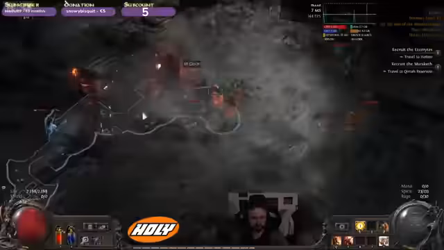 05:27:25Der Streamer bereitet sich auf den finalen Boss von Akt 2 vor. Er ist besorgt über die beschriebenen One-Shot-Mechaniken und bittet den Chat um Informationen, ohne Spoiler zu erhalten. Er überprüft seine Ausstattung und stellt fest, dass er mehr Damage und bessere Resistenzen braucht, um den Bossangriff zu überleben. Der Druck steigt, da er sich unzureichend gerüstet fühlt.