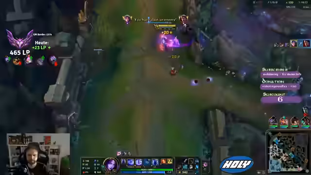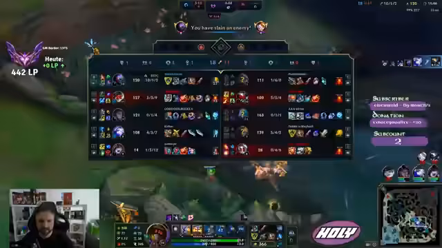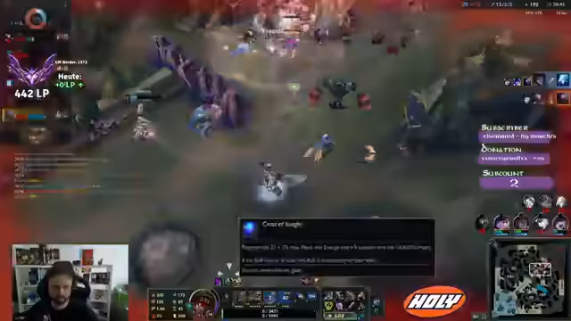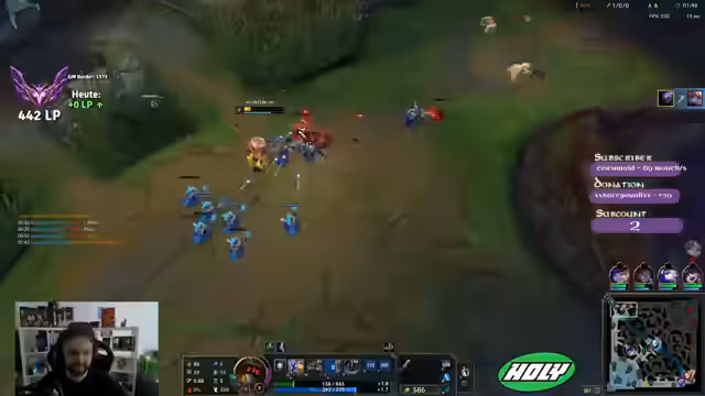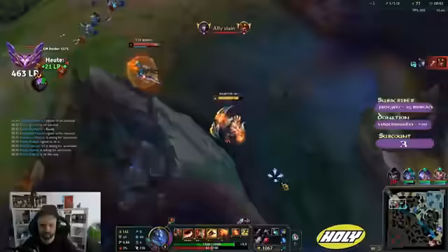 01:56:53Nach einer Serie von Fehlern wird das Spiel als verloren eingestuft. Der Streamer erwähnt, dass seine Botlane schlecht auf ihn reagiert hat. Nach der Niederlage wechselt er das Thema und spricht über die hohe Liga in League of Legends. Er fragt, ab wann hochklassige Spiele beginnen, und schätzt, dass diese wahrscheinlich erst bei 1000 bis 1200 LP stattfinden. Zudem äußert er sein Bedauern über eine verlorene Lane und das gefühlte Unrecht in der Partie.