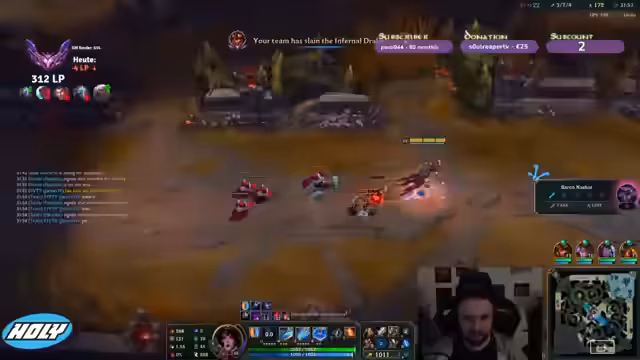 00:29:18Es wird festgestellt, dass seit einem Nerf des Legend-Drachen in 80% der Spiele dieser Drache erscheint. Die Jinx-Lulu-Kombo wird als stark und unangenehm (disgusting) beschrieben, insbesondere wenn sie drei Items erreicht hat. Der Streamer kommentiert seine Oriana-Performance und bedauert, dass er am Ende sogar vom Shen überfarmt wurde, was er auf zu viel Team-Fokus zurückführt. Er diskutiert die Problematik von Teleport (TP) in bestimmten Spielsituationen und Teamkompositionen, bei denen das Team möglicherweise nicht lange genug überlebt, bis der TP abgeschlossen ist. Der Streamer erwähnt, dass er seine Am Besser-Win-Ratio verbessert hat und nun bei 46% liegt. Er äußert den Wunsch, Am Besser zu spielen, sieht aber Atrox als einen guten Counter und plant, auf Kabil zu setzen und zu outscalen. Es wird eine Frage aus dem Chat aufgegriffen, warum er nicht in der LEC spielt, was er mit Humor kommentiert.