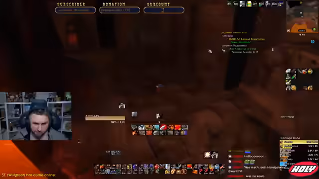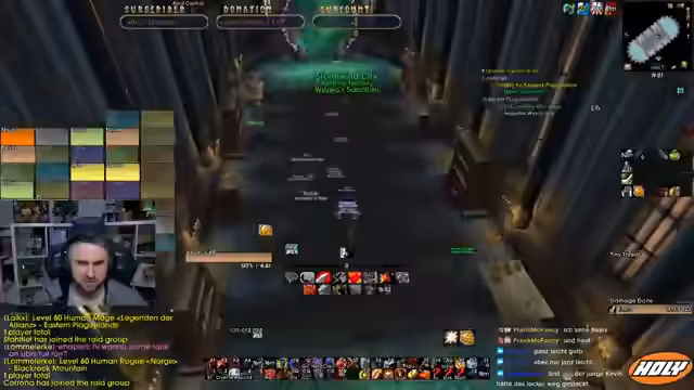 01:13:03Der Stream beginnt mit der Ankunft im Dungeon UBRS. Der Streamer rollt gegen Mitspieler und verliert diese, was im Chat für Gesprächsstoff sorgt. Die Gruppe bereitet sich vor, indem sie Ausrüstung wie Pazarlowatt sucht und einen kritischen Fehler bei der Aggroverteilung an den ersten Mobs begeht. Die Stimmung ist entspannt, und der Streamer beschreibt den ersten Pull als 'trocken', während der Rest des Mains unproblematisch verläuft.