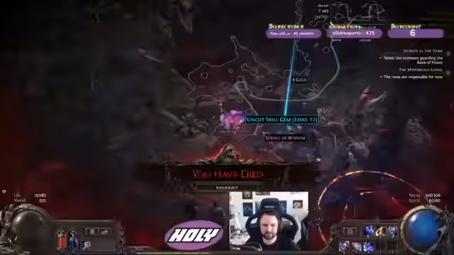 01:20:36Streamers erster Versuch, den Boss 'Viper' zu besiegen, verläuft problematisch. Er ist überrascht von dem geänderten Verhalten des Bosses, der viel aggressiver scheint und anders angreift als erwartet. Obwohl sein Damage 'krank' ist, fühlt sich der Kampf 'scuffed' an und er hätte ohne seinen hohen Schaden sterben müssen. Nach dem Kampf klagt er über die Ungerechtigkeit des Drops, da er nur sehr wenige Exalted Orbs gefunden hat, was für den Fortschritt entscheidend ist.