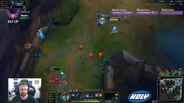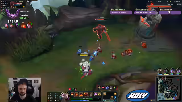 00:04:37Der Streamer spielt League of Legends und wählt den Champion Jax. Er kommentiert sein Gameplay, unter anderem einen Konqueror-Jax und die Schwierigkeiten im Match-Up. Es kommt zu einigen Fehlern und Selbstkritik, als er gegen einen Vampir-Champion verliert. Er äußert auch seine Frustration über seine Leistung und beschreibt sich als 'garbage'. Trotzdem gelingt es ihm später, einen Solo-Karry zu machen und mehrere Enemy Kills zu erzielen, was er als 'absoluter Solo-Carry' bezeichnet.