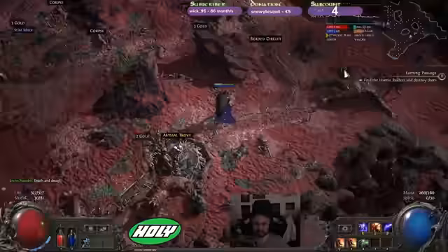 Im Spielverlauf wurde das Hauptziel ein Build mit hohem Chaos- und Zauberschaden. Dies wird durch Gegenstände wie ein seltener Schuh und ein Zauberstab gestärkt. Einigen Bossen wird aufgrund ihrer Stärke ausgewichen, während erfolgreiche Loot-Drops verzeichnet werden.